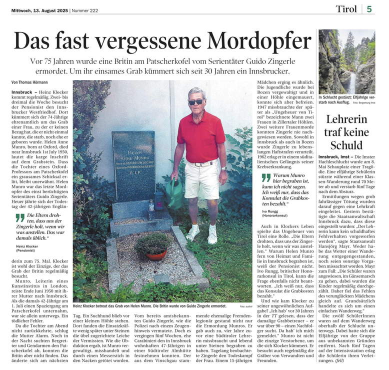 21. August 2025 Munro: Vergessenes Mordopfer Die ganze Geschichte dazu finden Sie in meinem Buch "Di TuXa" - hier FOTO GERALD AICHNER, 2020 tagPlaceholderTags: